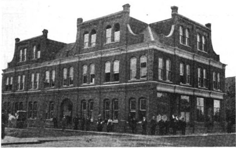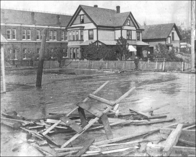 This is a photo of Decatur's home, where the Lincoln Theater stands today, and the new courthouse building behind it. You can see the flood damage on First Street in front of the house. We are looking northeast. We know that the photo was taken after 1893 when the first county courthouse was erected. At some unknown later date, the courthouse became known as the Matheson building, maybe when the upper story was dismantled, resulting in the building that still stands today at the southeast corner of Pine and First Streets.