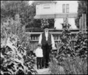 David Decatur with grandson Elden D. Pollock, who would later manage the Lincoln, in the midst of row crops on his farm south of Kincaid Street where Red Apple and Bank of America stand today. Decatur's house and barn are behind them across Kincaid and the courthouse is in the background. Since Elden looks to be about six, the photo must have been taken in about 1906.