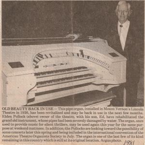 Elden D. and his brothers, Robert and David, became co-owners of the property, and Elden (pictured here with our Mighty Wurlitzer) acted as reluctant manager of the theater for the next 65 years. At one point, possibly after his divorce to his second wife Margaret, or after losing money from some bad investments (according to son Donald Pollock), Elden D. lived in the tiny attic adjacent to the stage. Elden’s loft, as we call it today, is accessed by a drop-down ladder in the backstage crossover, and stands as a reminder of harder times. Elden D.'s children, John, Donald, and Edward spent their early childhood years at the Lincoln. The youngest brother, Edward Pollock who suffered from Marfan syndrome or a similar disorder managed the other family properties on the block and worked to help restore the mighty Wurlitzer that had fallen to disrepair since “talking pictures” in the late 1920’s made the mighty instrument obsolete. The people who remember him always talk about his enormous hands. "Big enough to hold a basketball". According to John Pollock, "Ed Pollock, who was managing the building which included the Lincoln Theatre, but not the theatre itself, died suddenly in 1985 at age 36 on the street in front of the theatre as he was leaving for the day. The theatre itself had been operated in recent years by various tenants, and was not infrequently on the brink of closure. The theatre and the surrounding shops were owned, and sold a few years later, by Elden D., Robert and David Pollock to the Pickett family in the early 1980s and the theater foundation was formed in 1987 to provide a community financial base for restoration of the property.