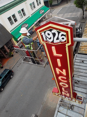 Above: Brett Milton, of Meyer Sign and Advertising Company, in May of 2011, putting on the final touches to our replicated blade sign, the original of which was destroyed in the 1980s. For the complete story of our Blade Sign Campaign (Project 85) follow this link.